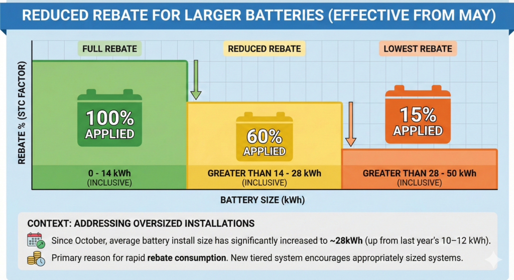 To address this and encourage the installation of appropriately sized batteries, the rebate will only fully apply to smaller systems and will taper down for larger capacity batteries. Subject to regulations, the following changes will come into force from the start of May: